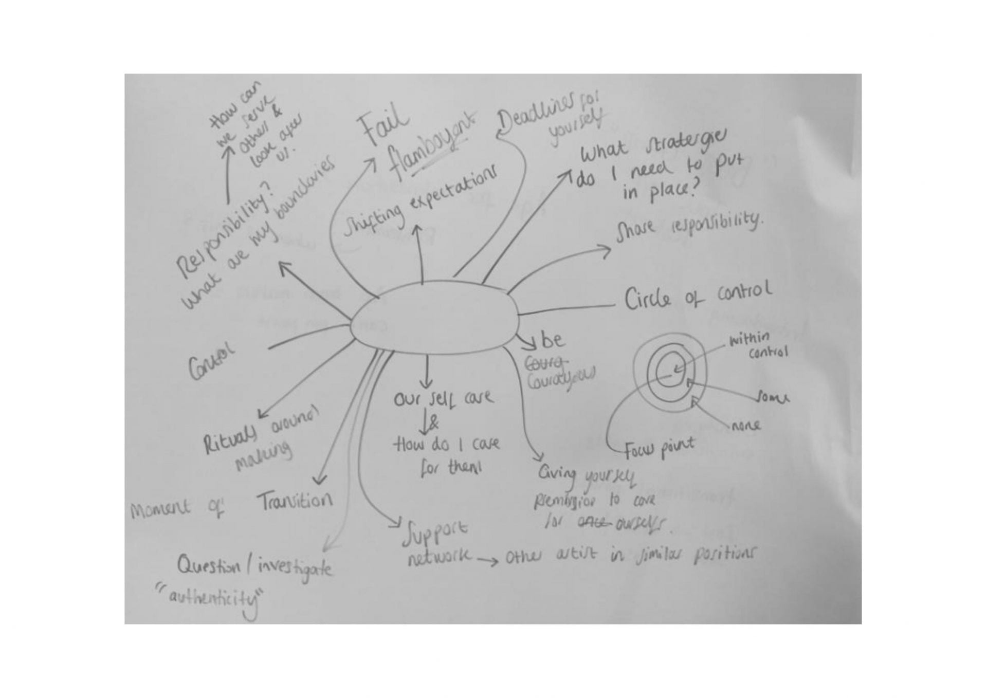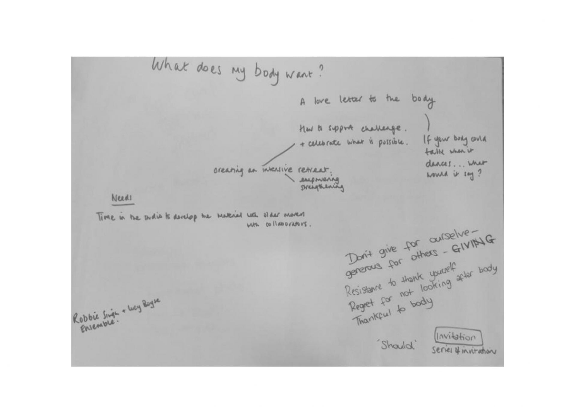 Artists Adrienne Melling, Alex Mettam, Louise McDowall, Lucy Haighton, Minoti Parikh and Sara Giddens came together in the studio to commence Yorkshire Dances ‘Thinking Space’ project. Each artist shared a rich variety of experiences, bubbling ideas and creative tasks. This day also left space for the artists to share their fears, anxieties and methods of how they cope and sometimes don’t cope with them. The following includes notes, reflections and resources that were made from or inspired the journey of the day in the studio.