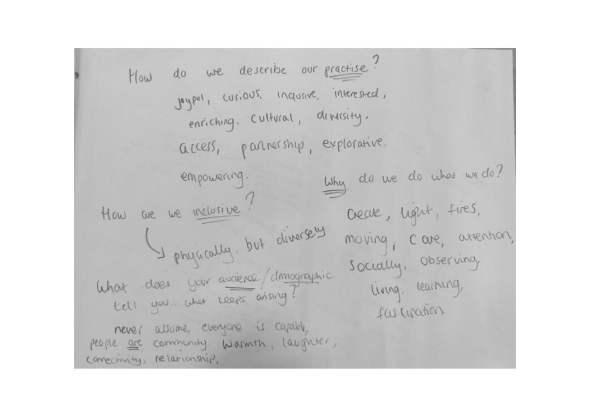 “I think what Thinking Space has really made possible is a bringing together of committed practitioners that share a common interest, and for us to share and learn with and from each other without the usual pressures of leading a session. I just want to foreground how important I feel it is for us to take time to look at our own care. We are so very busy thinking of others, creating safe and welcoming spaces for our collaborators and practitioners that it is very easy to forget to ask who is looking after us (as freelancers) and how are we looking after ourselves? This feels to me like a really important and timely place to focus upon and for organisations such as YD to also foreground.”