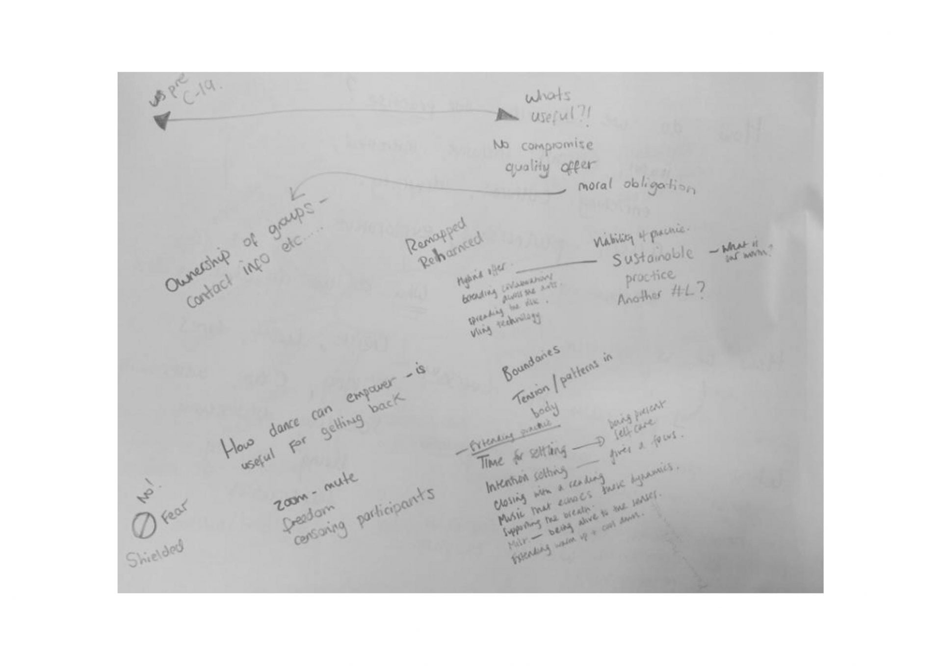 “I want to go into a space. Enter a possibility for openness and holding. To be co facilitated and held. To share and learn. Not just through words and talking but through feeling and holding and doing. Expressing to the ends of my body so that my antennas can reflect on this last week, month, year. I want to breathe, to pause. To take time. Take a physical stock”